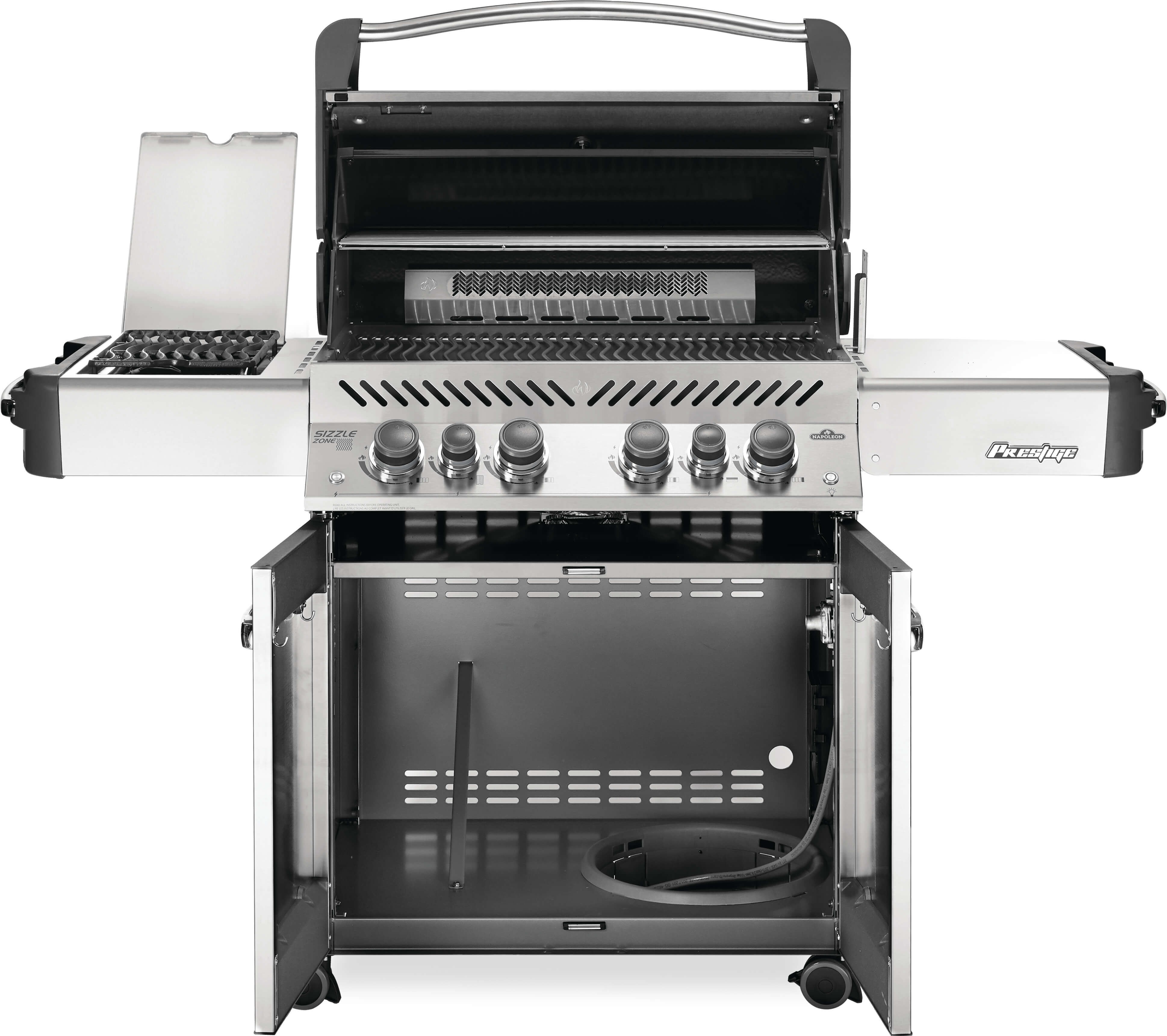 Il Napoleon Prestige® 500 a gas propano è un barbecue completo con struttura e cappa in acciaio inox, progettato per prestazioni professionali. Dotato di 4 bruciatori principali, bruciatore posteriore a infrarossi e laterale a infrarossi, permette fino a otto stili di cottura. Può grigliare fino a 30 hamburger più altri 8 sul bruciatore laterale. Le griglie WAVE™ garantiscono i tipici segni di cottura, mentre bruciatori, diffusori e griglie interne sono anch’essi in inox per massima durata. I 7 diffusori riducono le fiammate vaporizzando le colature. Le manopole SafetyGlow si illuminano di rosso quando un bruciatore è acceso. Perfetto per cotture uniformi con girarrosto e infrarossi posteriori.