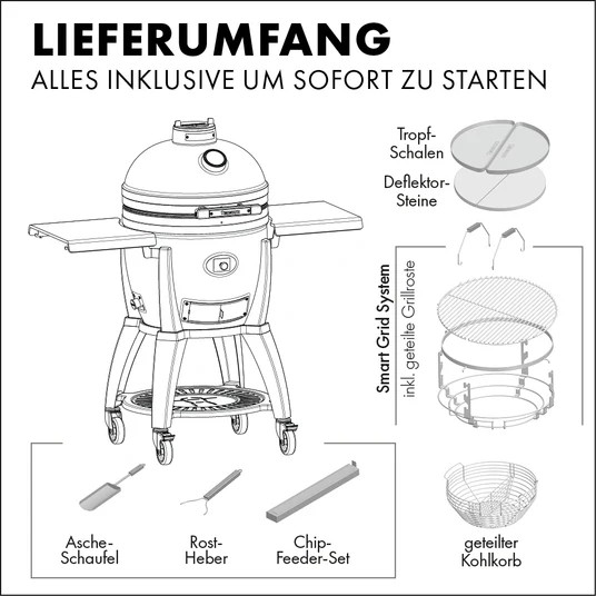 Accessori inclusi: griglie a mezzaluna, deflettori per cottura indiretta, vassoi per raccogliere grassi e liquidi, paletta per la cenere, sistema per aggiungere trucioli per affumicatura senza aprire il coperchio, sollevatore griglie.