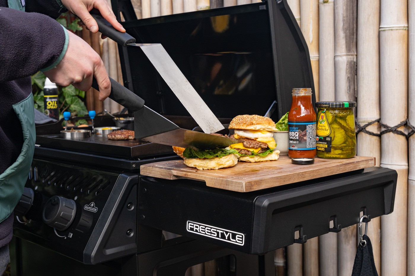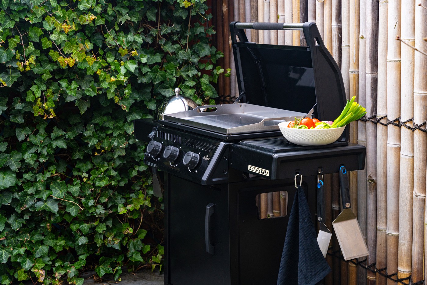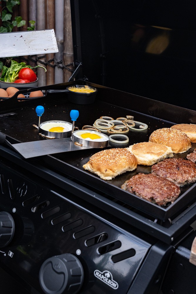 La Freestyle™ 24 Plancha Antiaderente Pre-Condizionata è pensata per chi cerca versatilità, durata e stile nella cucina all’aperto. La piastra in acciaio pre-condizionato da 3,5 mm offre un’eccellente ritenzione del calore e una cottura uniforme. La naturale stagionatura garantisce un effetto antiaderente e protegge la superficie da graffi, permettendo l’uso di utensili metallici. Tre potenti bruciatori da 25.200 BTU assicurano un calore uniforme, dalle basse temperature per piatti delicati all’alta intensità per rosolare. I ripiani laterali pieghevoli con ganci portautensili offrono praticità, mentre il vassoio raccogligrassi frontale con bocchetta ergonomica mantiene l’area pulita. Completano il tutto un coperchio a doppio snodo e un apribottiglie integrato.